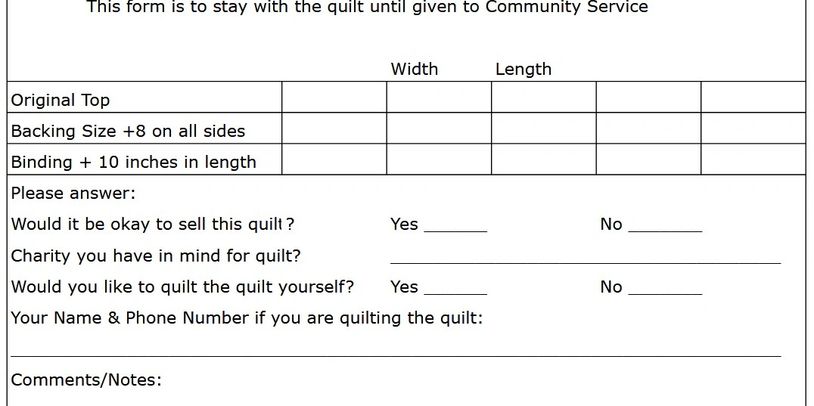 Please fill out this form for each quilt placed in the bin in cabinet 104S. This helps us to know the status of the quilt. You can also download the form for your use.